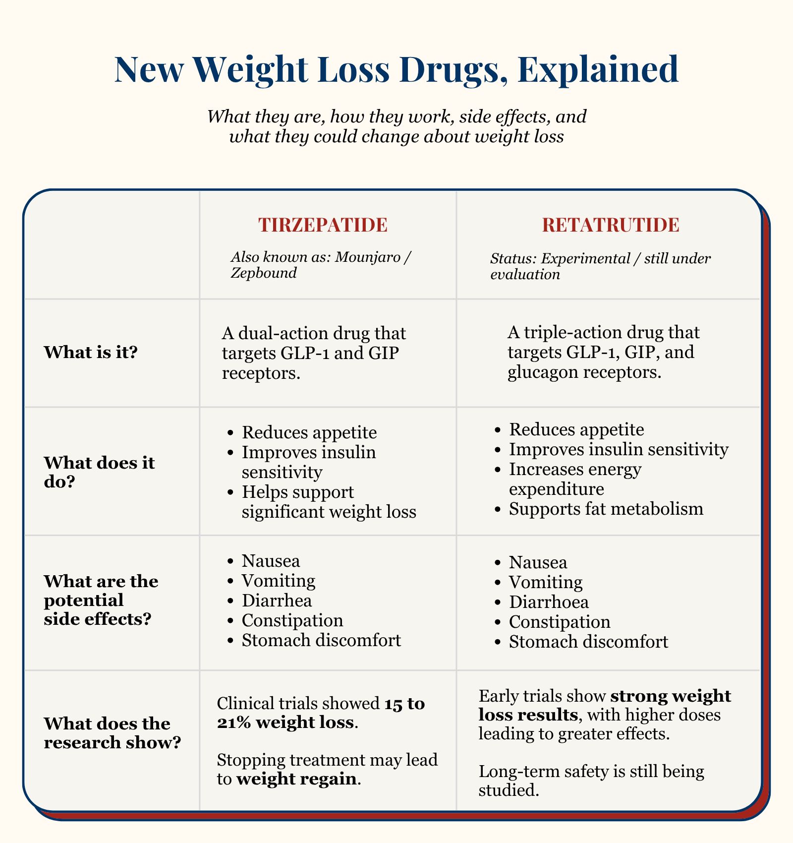 New therapies like tirzepatide and retatrutide work by targeting specific hormones that regulate appetite, metabolism, and energy use.